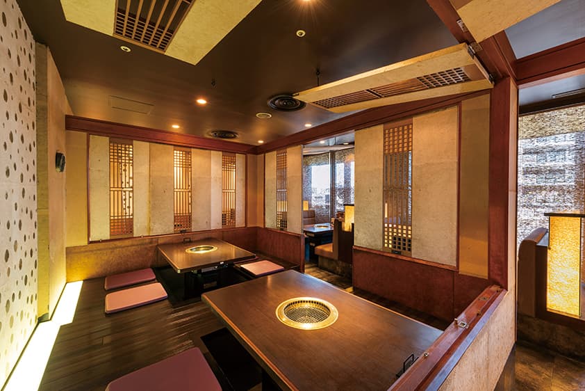 JR・京王相模原線 橋本駅直結ミウイ橋本5階の使いやすい立地。夜景の見える開放的な空間が魅力のテーブル席を始めとしたプライベートを大切にした店内です。掘りごたつ席は扉を閉めると個室感覚で使用可能。大型宴会も可能なお席をご用意しております、韓国風建築の落ち着いた空間でごゆっくりお食事をお楽しみ下さいませ。
