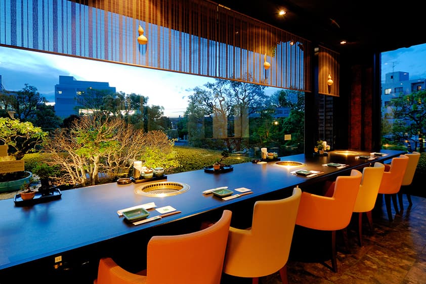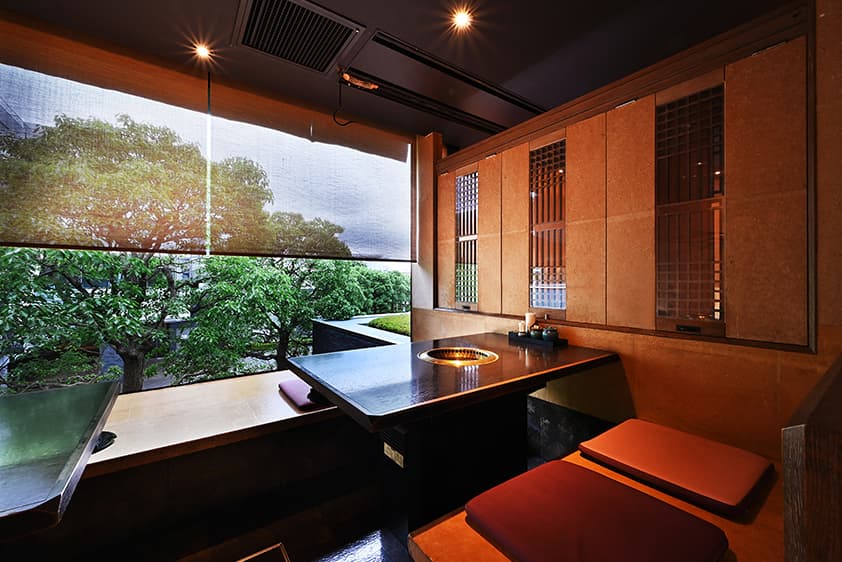 駅前とは思えない緑に包まれた隠れ家のような空間でいただく焼肉。個室感覚のプライベートな雰囲気の店内、カウンター席は開放的な空間。ゆったりソファーが心地良いボックスタイプのテーブル席もございます。全席無煙ロースター完備なので、匂いや煙などを気にせず安心して焼肉ををお楽しいただけます。