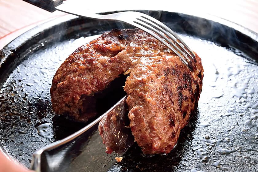 当店のハンバーグは、炭焼で焼き上げる香り豊かな牛肉100%ハンバーグ! 肉本来の美味しさを追求し、つなぎを一切使用しない 「ステーキのようなハンバーグ」を実現。高温の炭火でお肉の表面を一気に焼き上げて肉汁と旨味を閉じ込めます。 仕上げは提供時にスタッフがお客様の目の前で豪快にカット。 溢れ出る肉汁とソースが絡んで最高の味わいをお楽しみ頂けます。